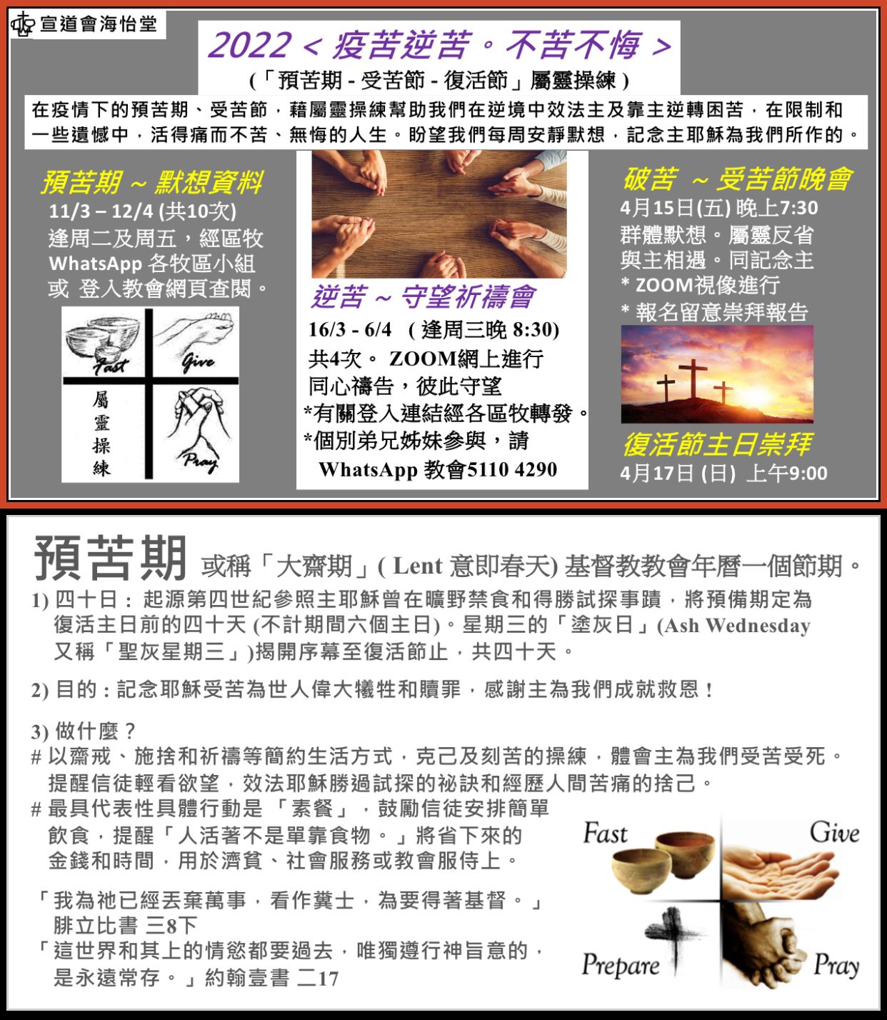 在預苦期中,讓我們藉屬靈操練幫助我們在逆境中效法主及靠主逆轉,在限制和一些遺憾中,活得不苦不悔。